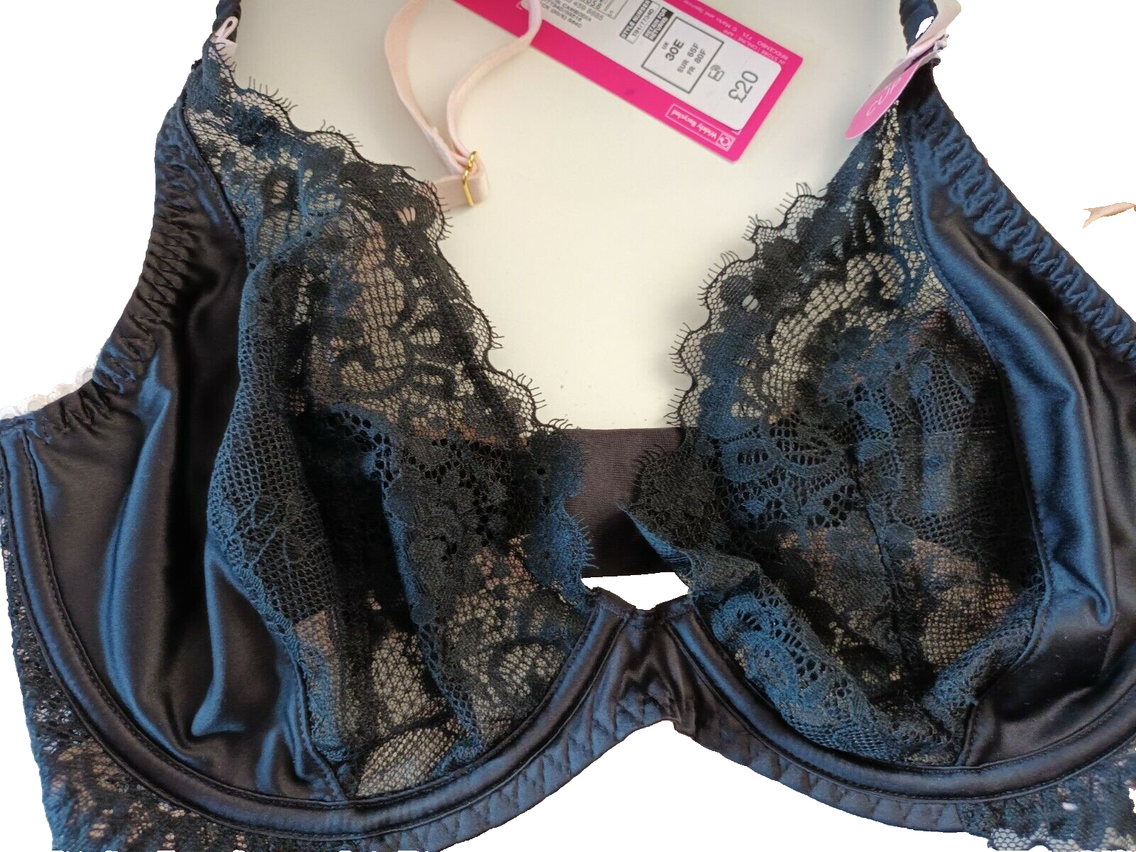 M&S Boutique UK 30E Black Mix Underwired Satin & Lace Cup Plunge Bra