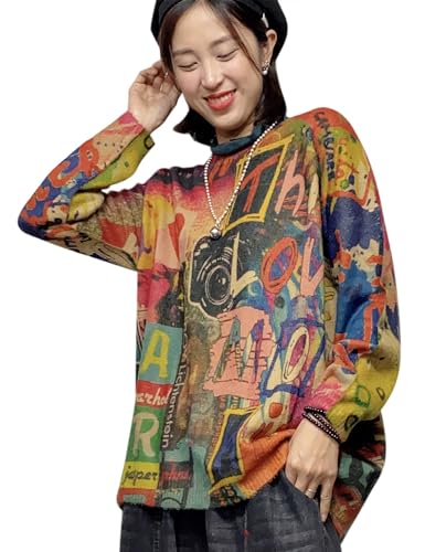 YESNO Women Long Sleeve Jumpers Oversized Graphic Knitted Sweater Crew Neck Loose Vintage Pullover Sweater Tops (M S01UK CR27)