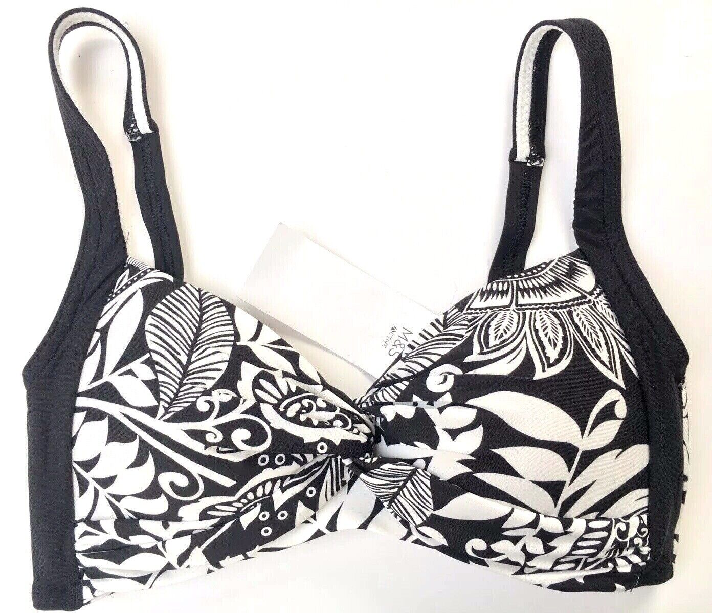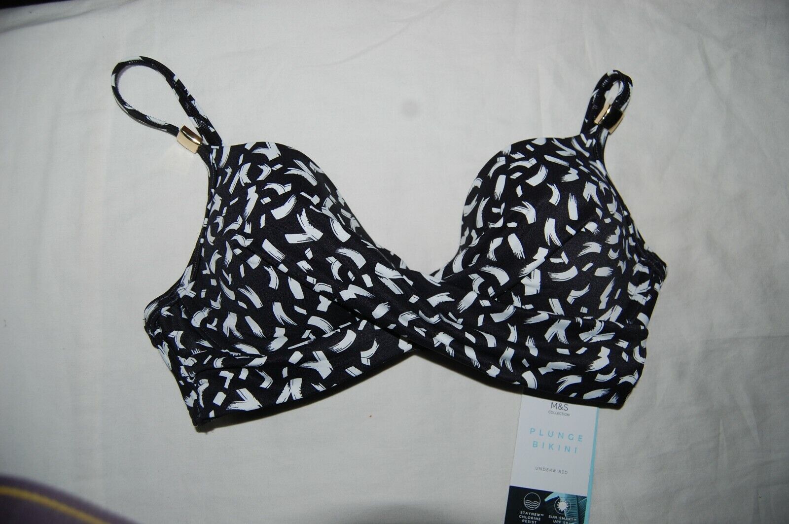 M&S Black and White Underwired Plunge Bikini Top Size UK 32D UPF 50+ BNWT