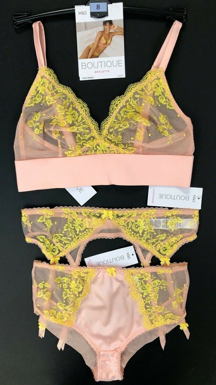 M&S Boutique Bralette UK 8 Suspenders UK 10 & Knickers UK 8 Apricot BNWT