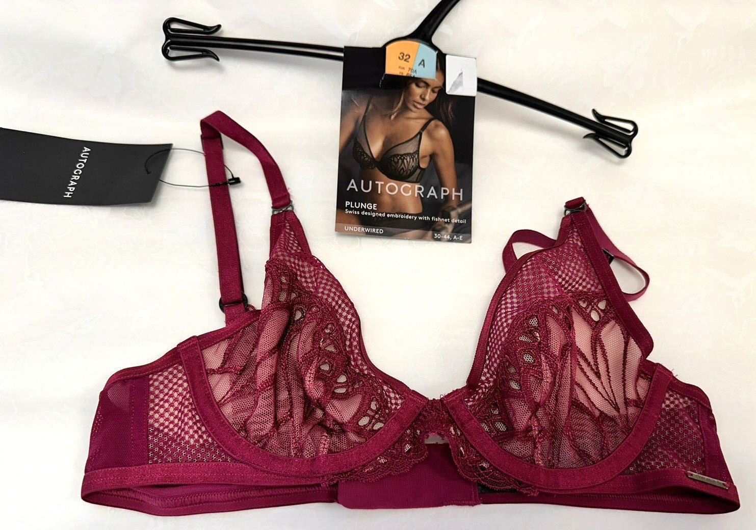 NEW! M&S Autograph UK32A cerise non-padded underwired fishnet detail plunge bra