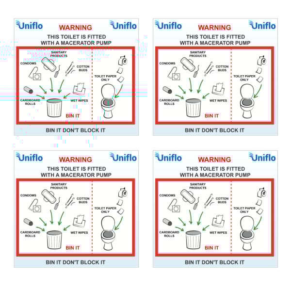 Uniflo Macerator warning sticker pack of 4 for Saniflo Grundfos Macerator Pumps.
