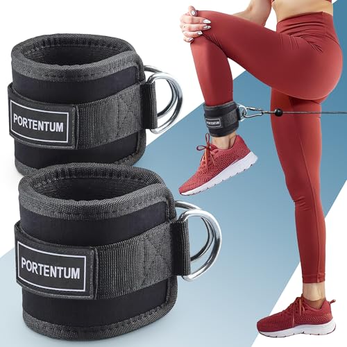 PORTENTUM Ankle Straps for Cable Machine (Set of 2) Gym Cuffs with Double Stainless Steel D-Ring, Gym Ankle Cuff with Adjustable Neoprene Velcro, Unisex Muscle Shaping