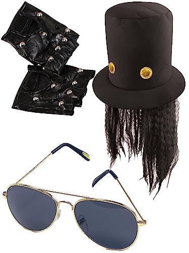 Mega_Jumble® 80s Slash Guitar Hero Punk Rocker Kit - Rock Star Hat with Hair, Black Studded Gloves & Sunglasses Fancy Dress Mad Biker/Rocker Set