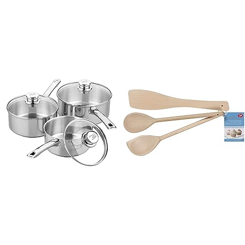 Tala Performance 3 Piece Stainless Steel Cookware Set, Saucepans with Glass lids, 16, 18 20cm. Made in Portugal, Suitable for All hob Types Including Induction + Tala Set of 3 Wooden Cooking Utensils