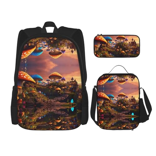 SDEGTHO Magic Mushroom Bookbag Set Includes Large Capacity Backpack,Lunch Box And Pencil Case 3 Pieces Bagpack Sets, Black, One Size