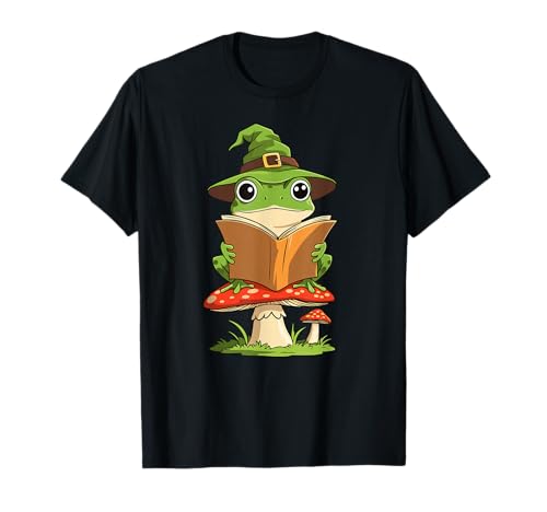 Bookish Frog Wizard On Toadstool Mushroom Magic Reading T-Shirt