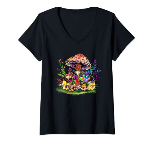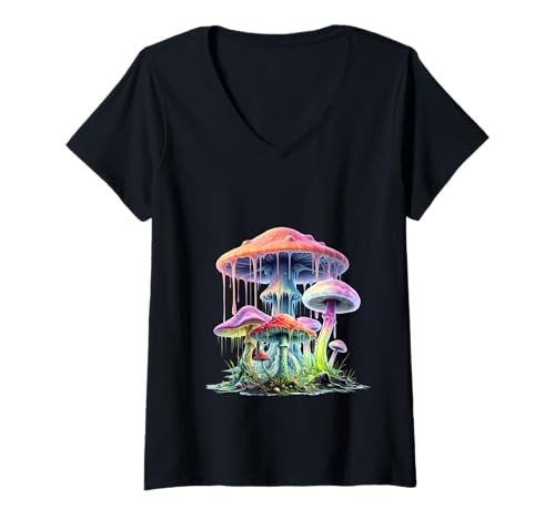 Womens MUSHROOM TRIPPY MAGIC MUSHROOM RAINBOW PSYCHEDEDELIC CUTE V-Neck T-Shirt