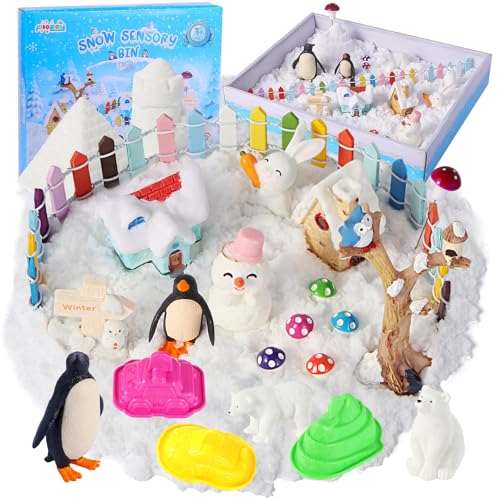 FIIOEOY Snow Sensory Bin Play Sand Art Kit with Arctic Animal Figures, Winter Wonderland Magic Sand Toy for Toddler Ages 3 4 5 6 7 8