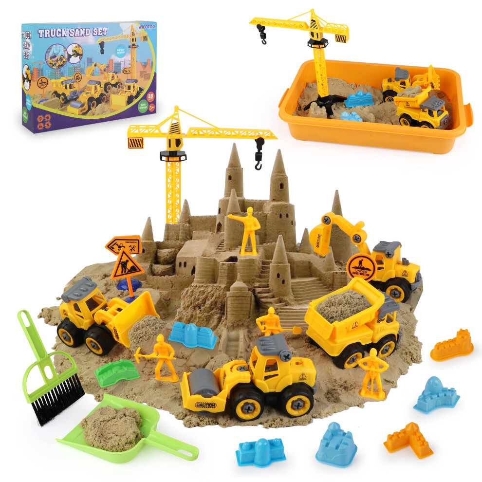 WICOTOO Sand Construction Kit Sandbox 2.2lbs Magic Sand W/4 Take Apart Construction Trucks Tower Crane 8 Sand Molds 4 Worker Figures 4 Road Signs Toys