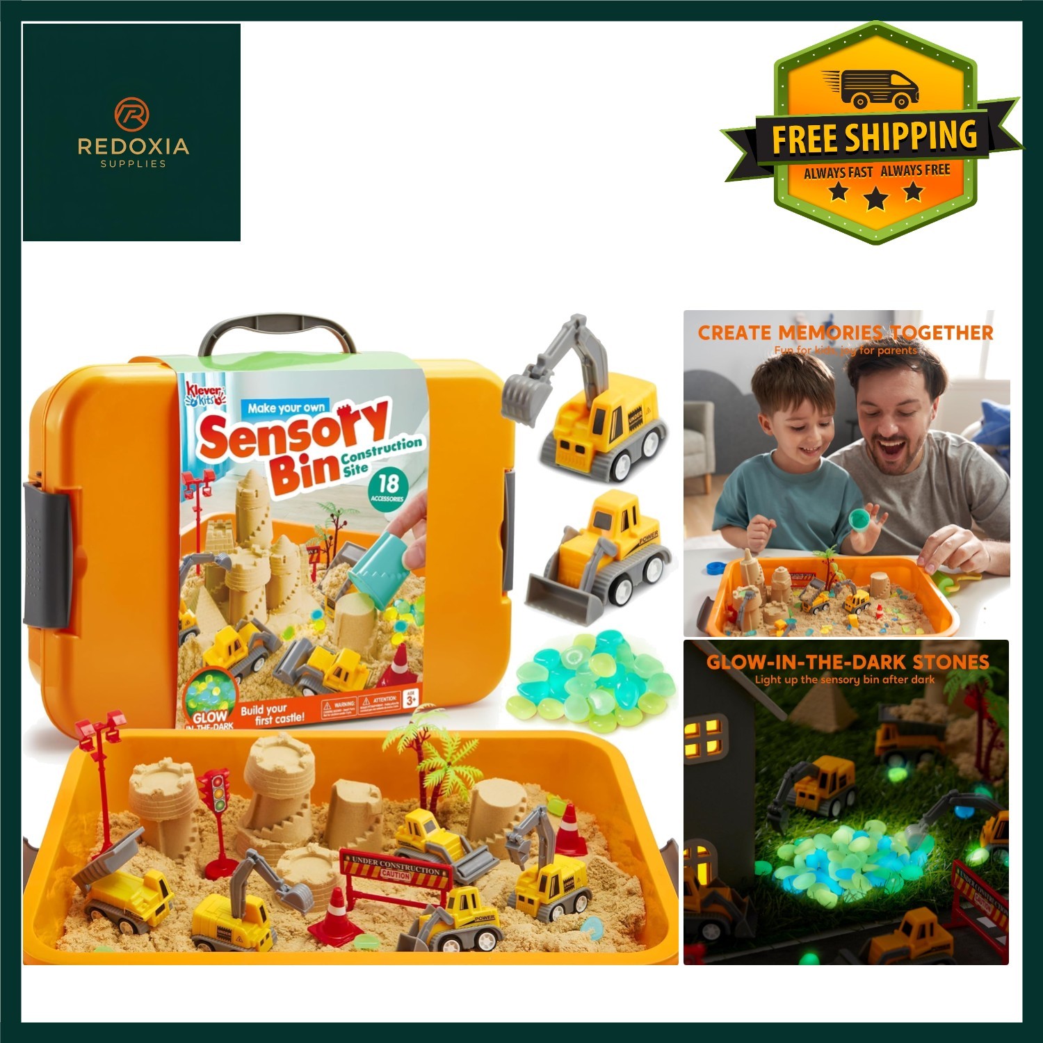 Klever Kits Construction Sensory Bin for Toddlers with Glow in The Dark Stones Sandbox with Lid Magic Sand Castle Building kit Preschool Learning Ac