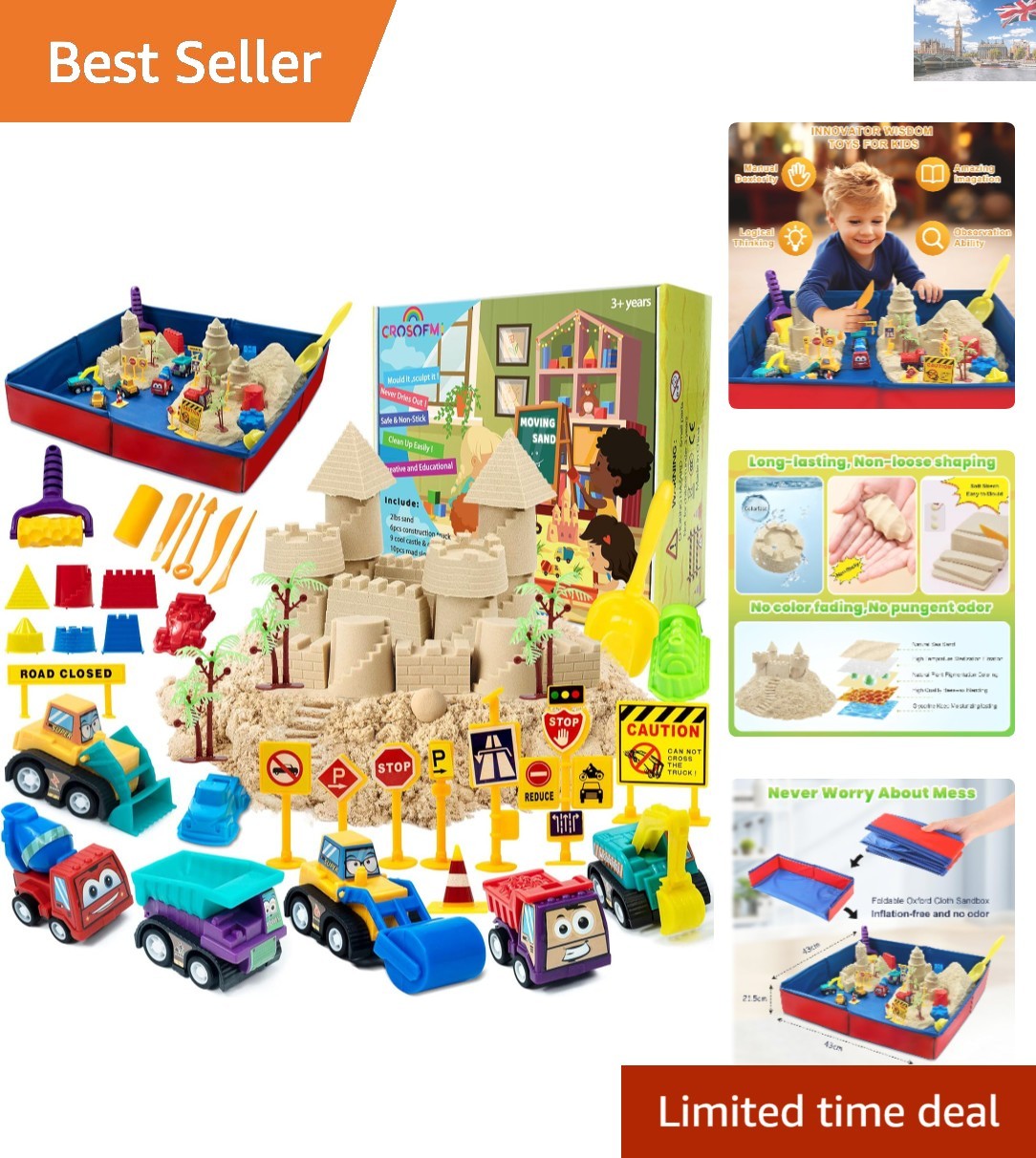 CROSOFMI Play Sand for Kids 2lbs Magic Sand with 6 Construction Vehicles 10 Road Signs and Foldable Sandbox and Moulds and Tools Toys for Boys Girls 3 4 5 6 7+ Year Old
