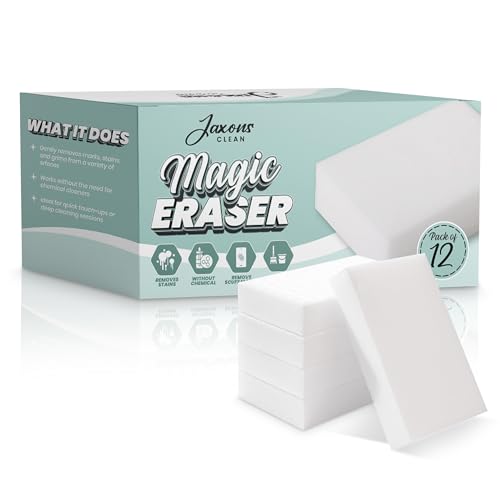 Jaxons Clean Magic Eraser Sponges – 12 Pack, Heavy Duty Melamine Foam Cleaning Pads for Home, Kitchen, Bathroom, Walls, Baseboards, Size 4.7" x 2.5" x 1.2"
