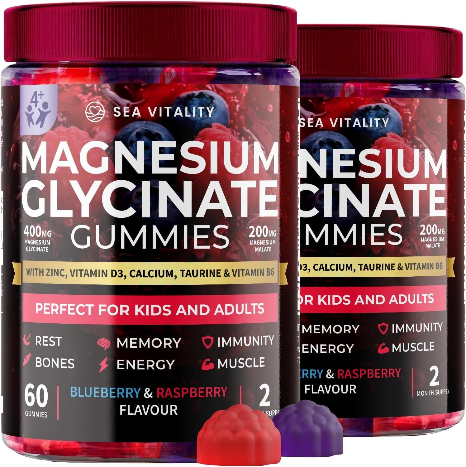 Magnesium Glycinate Gummies for Kids & Adults – Supports Rest, Bones & Muscles – Blueberry & Raspberry Flavours - Magnesium Glycinate 3-in-1 Gummies with Malate, Zinc, D3, B6 & Taurine – 60 Chews