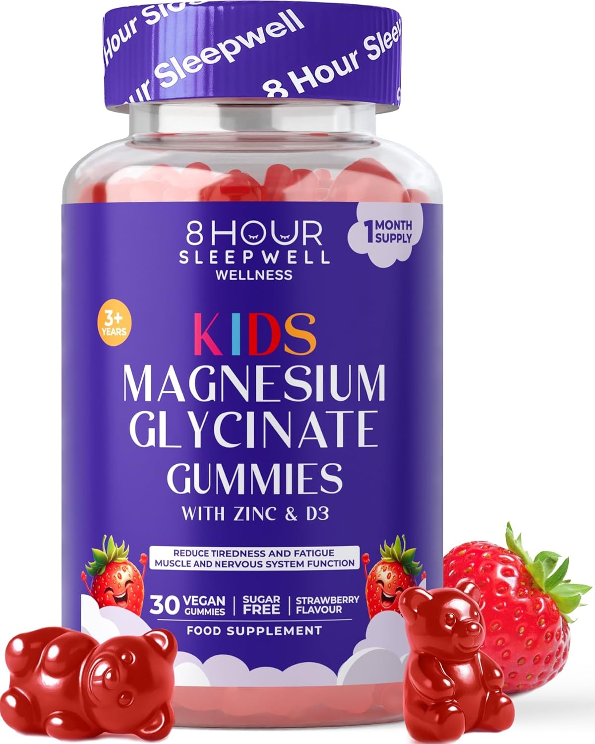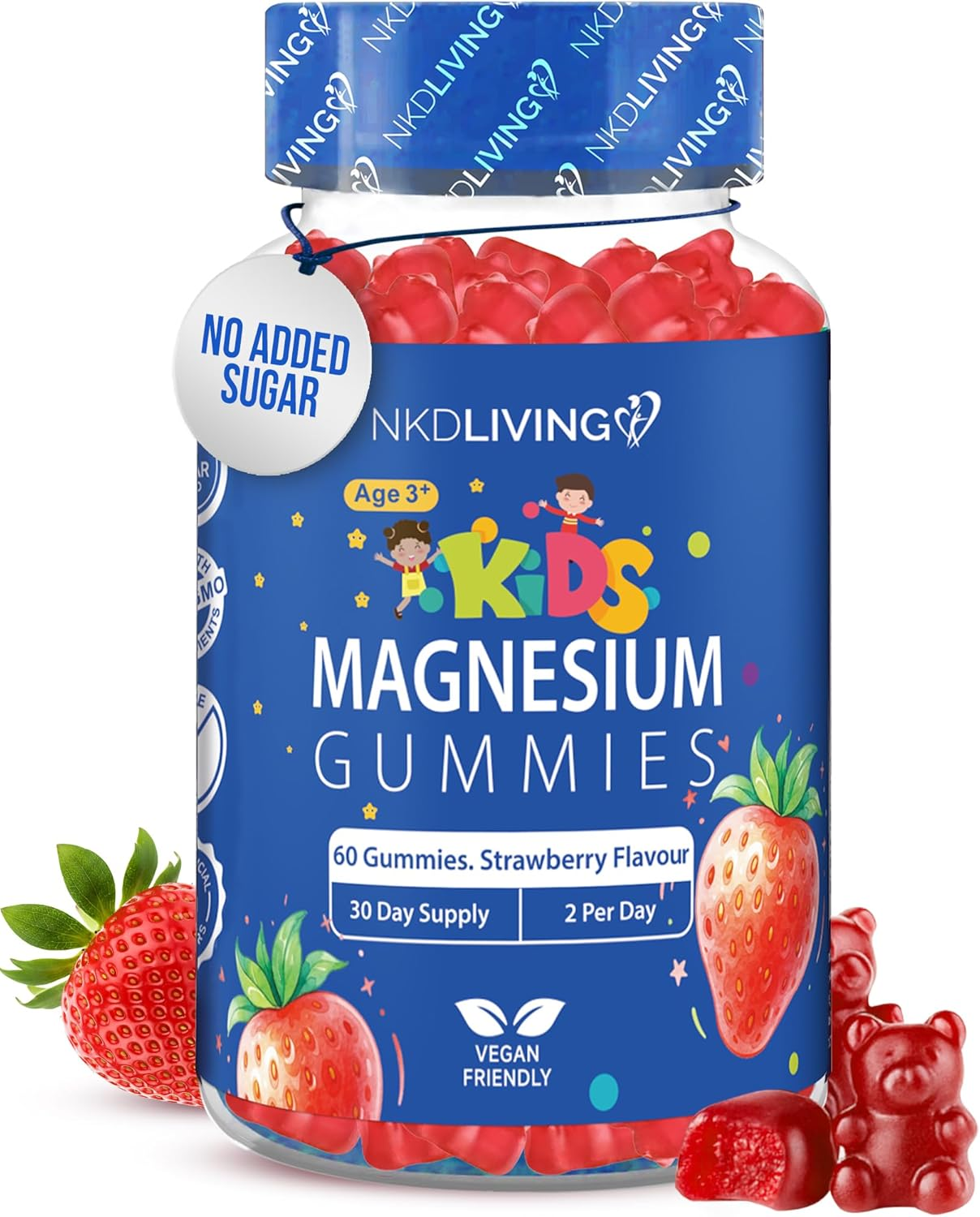 Kids Magnesium Glycinate Gummies – 1 Month Supply | Sugar-Free, Vegan & Chewable | 470mg Magnesium for Kids, Providing 65mg to Support Calm Mind & Focus for Children Ages 3+ | Strawberry Flavour