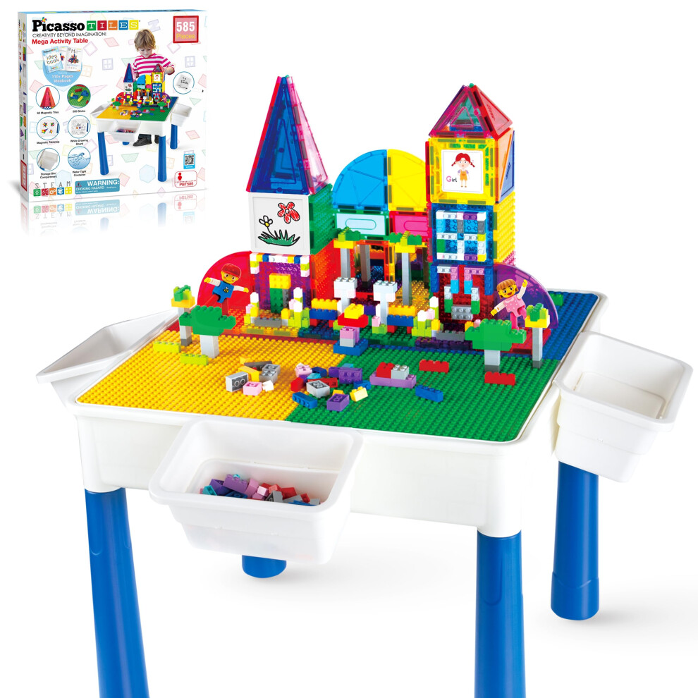 PicassoTiles 585pc Kids Activity Table with Magnetic Tiles and Bricks STEM Pretend Play Learning with Reversible Brick Whiteboard Tabletop Storage Bins and Extra Add-On Toys Boys Girls Ages 3+ PBT585