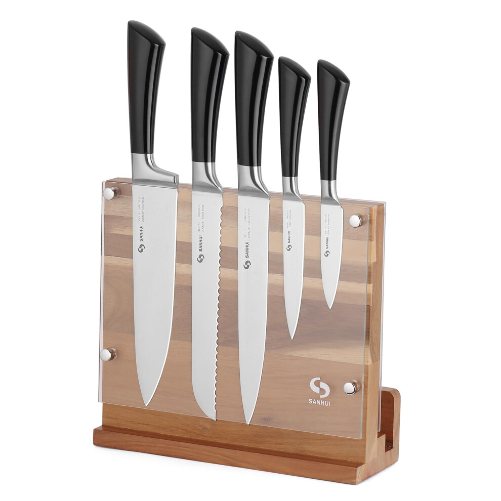 SANHUI 6-Piece Knife Block Set with 5 Kitchen Knives Stainless Steel and 1 Magnetic Knife Stand Acacia Wood Knives Holder Storage Rack
