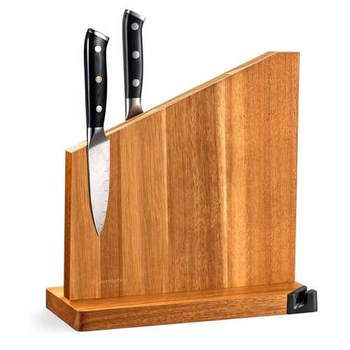 Gourmetop Knife Block Without Knives, Magnetic Knife Holder with Sharpener, Magnetic Knife Block with Sharpener, 100% Acacia Wood Magnetic Knife Holder, Double-Sided Magnetic Knife Block, Light Wood