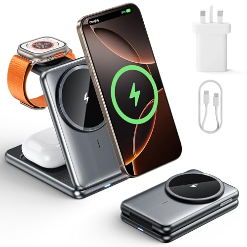 AJPARTS UK 15W 3 in 1 Magnetic Wireless Foldable Charging Station, mag-safe Charger for I-Phone 15/14/13/12/Pro/Pro Max/Mini, for IWatch Ultra 9/8/7/6/ SE/5/4/3/2 and air-pods 3/2/Pro/Pro 2