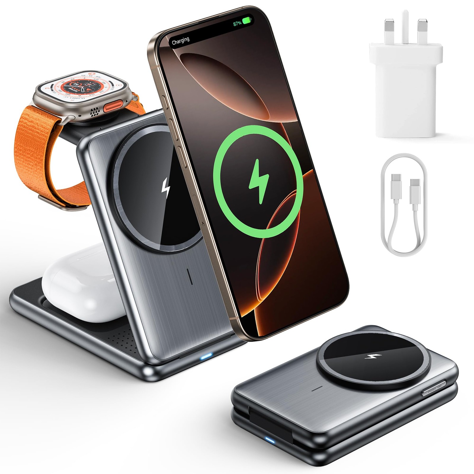 Chronus 3 in 1 Wireless Charging Station, Magnetic Phone Charger, Fast Wireless Charger Stand for iPhone 15-12/Pro Max/Mini, iWatch, Airpods(Gray)