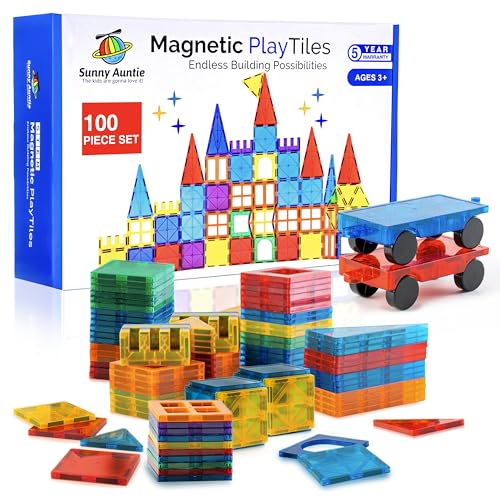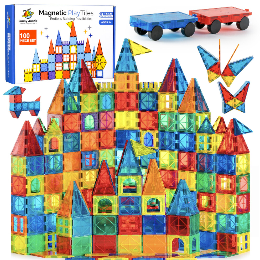 SUNNY AUNTIE Magnetic Tiles 100 PCS with 2 Cars, Magnetic Tiles for Kids & Toddlers, Toy for 3 4 5 6 7 8 Year Old Boys & Girls, Gift Box