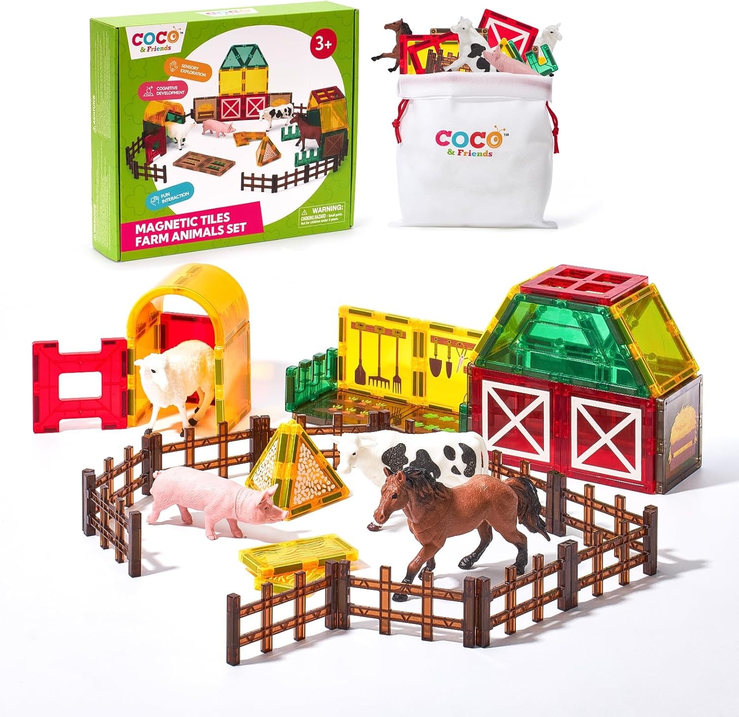 COCO&Friends Magnetic Tiles Farm Animals for Toddlers Kids Ages 3-8, Magnetic Blocks Building Toys Kids Magnetics Toys, Birthday Gifts for 3 Year Olds Girl Boy Sensory Development Toys