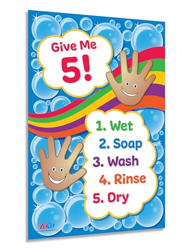 Safety Magnets Give Me 5 Handwashing Poster - Laminated, 12 x 18 inches - Wash Hands Sign for Kids - Hand Hygiene Health Poster for Daycare, Pre K and Elementary - School Nurse Office Decorations