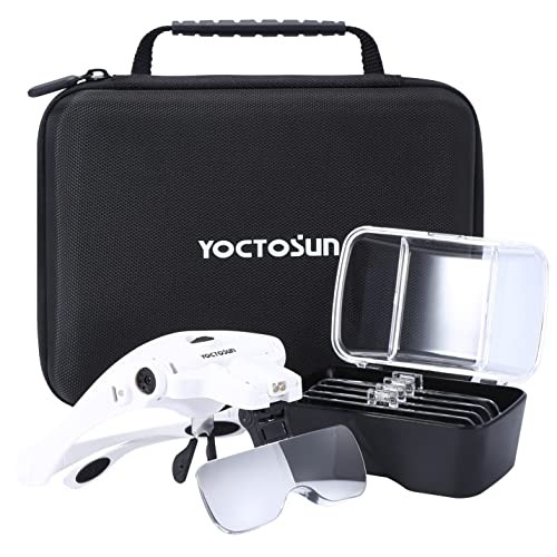 YOCTOSUN Magnifying Glasses with Light, Head Mount Magnifier with 5 Lenses, Headband, Storage Case, Hands Free LED Lighted Head Magnifying Visor for Close Work Hobby Crafts