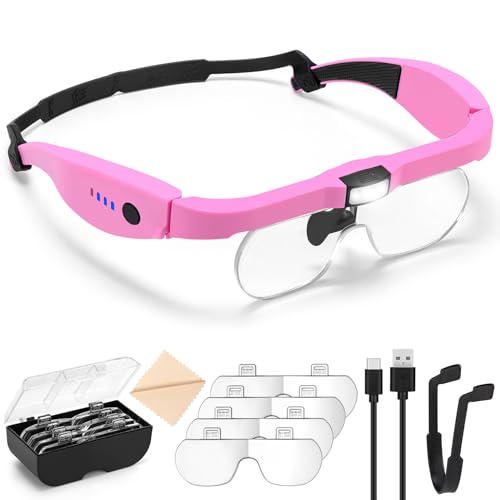 Exgoon Magnifying Glasses with Light, 1.5X to 5X Magnifying Glass with 4 Detachable Lenses, Hands Free Rechargeable Headband Magnifier for Close Work Hobbies Reading Crafts Jewelry (Pink)