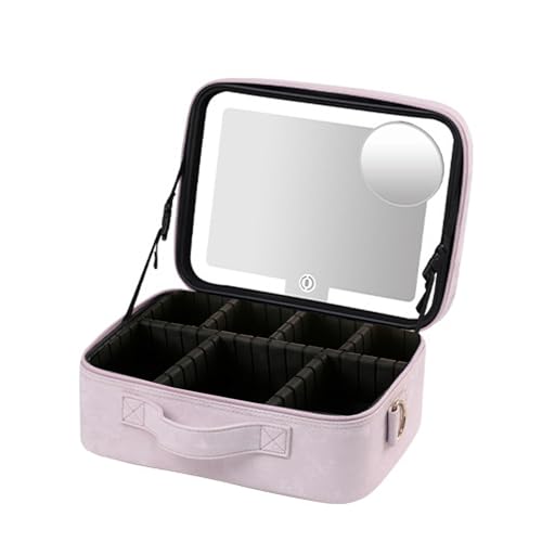 Travel Makeup Bag with LED Mirror,Travel Makeup Organizer,Makeup Case with Lighted 3 Color Setting,Waterproof Makeup Box with 10X Magnifying Mirror,Adjustable Dividers,Pink