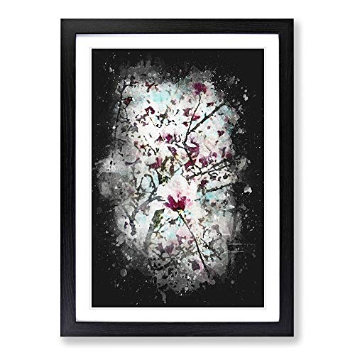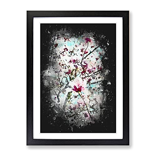 Pink Magnolia Blossom Tree Paint Splash Modern Framed Wall Art Print, Ready to Hang Picture for Living Room Bedroom Home Office Décor, Black A4 (34 x 25 cm)