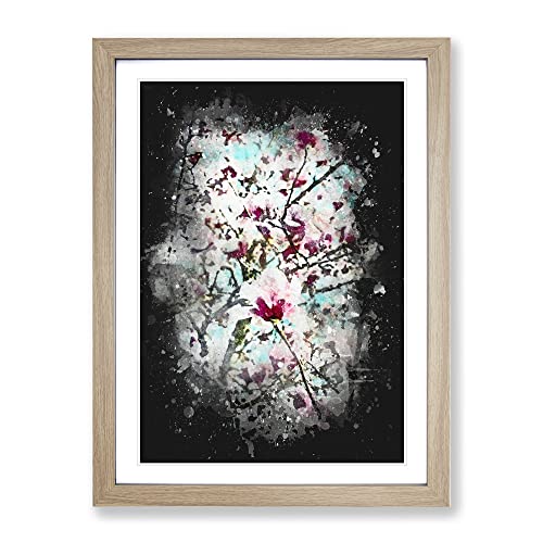 Pink Magnolia Blossom Tree Paint Splash Modern Framed Wall Art Print, Ready to Hang Picture for Living Room Bedroom Home Office Décor, Oak A4 (34 x 25 cm)