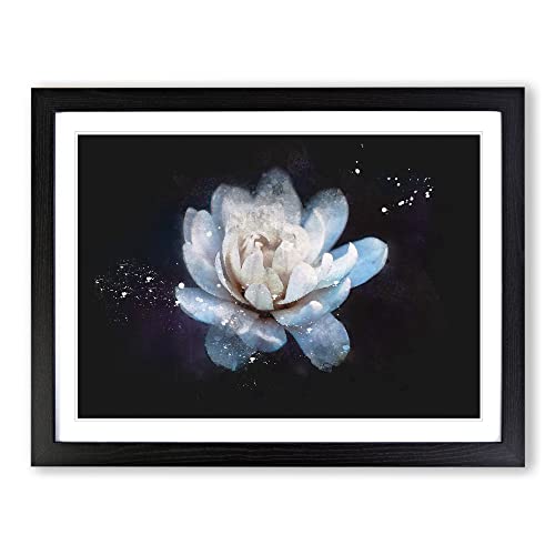 Blue Magnolia Flower Paint Splash Modern Art Framed Wall Art Print, Ready to Hang Picture for Living Room Bedroom Home Office Décor, Black A4 (34 x 25 cm)