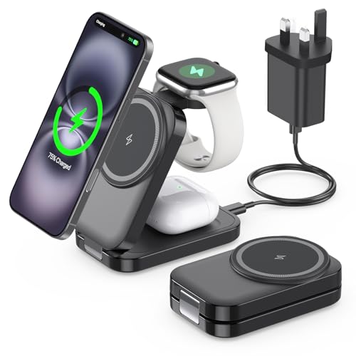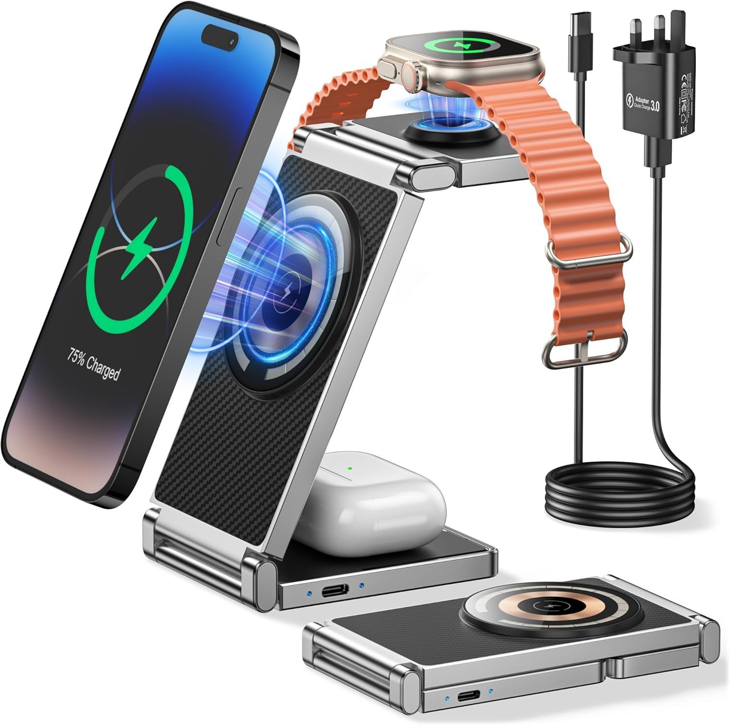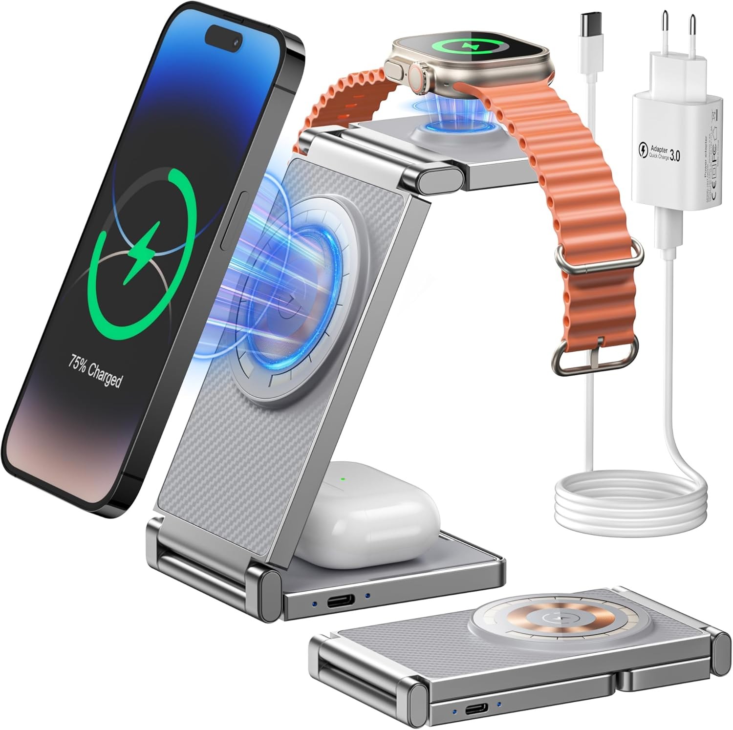 3 in 1 Wireless Charging Station for Apple,Foldable Magnetic Wireless Charger,15W Fast for MagSafe Charger Stand for iPhone 17/16/15/14/13,for Apple Watch,for AirPods
