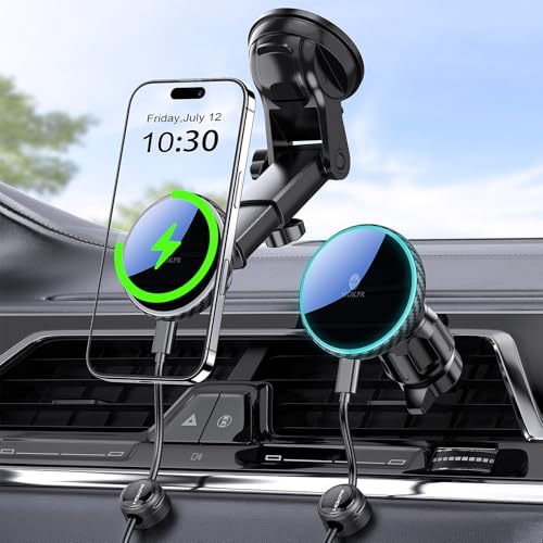 CloudValley for MagSafe Car Mount Charger, 15W Wireless Rapid Charging & 360° Rotating Vacuum Suction Cup, Magnetic Phone Holder with RGB Light for iPhone 17/16/15/14/13/12/Dash/Windshield/Screen