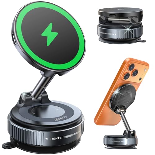 Beeasy for Magsafe Car Mount Charger, [Vacuum Suction Cup] 360° Adjustable 15W Fast Charging Magnetic Wireless Car Charger for Dashboard, Magnetic Car Mount for Phone 17/16/15/14/13/12 Series