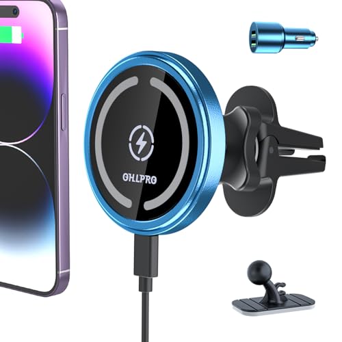 OHLPRO for iPhone16 Magsafe Car Mount Charger, 15W Fast Charging Dashboard Magnetic Car Phone Holder - Vent Clip and 3M Adhesive Base Never Block Air for iPhone 15/14/13/12 Series Magsafe Case, Blue