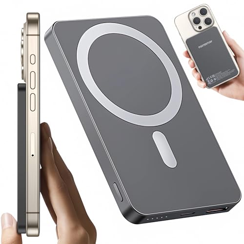 PORTENTUM MagSafe power bank fast charging 10000 mAh ultra-slim 14 mm – Portable charger magnetic 22.5 W PD & QC – Qi 15 W wireless – Battery pack USB-C + USB-A for iPhone Samsung Smartphones Tablets