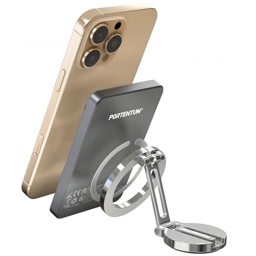 PORTENTUM Car Phone Holder MagSafe Foldable Silver + MagSafe Power Bank Fast Charging 10000 mAh Ultra-Slim 14 mm | Wireless Charging and Stable Mount for Safe Journeys
