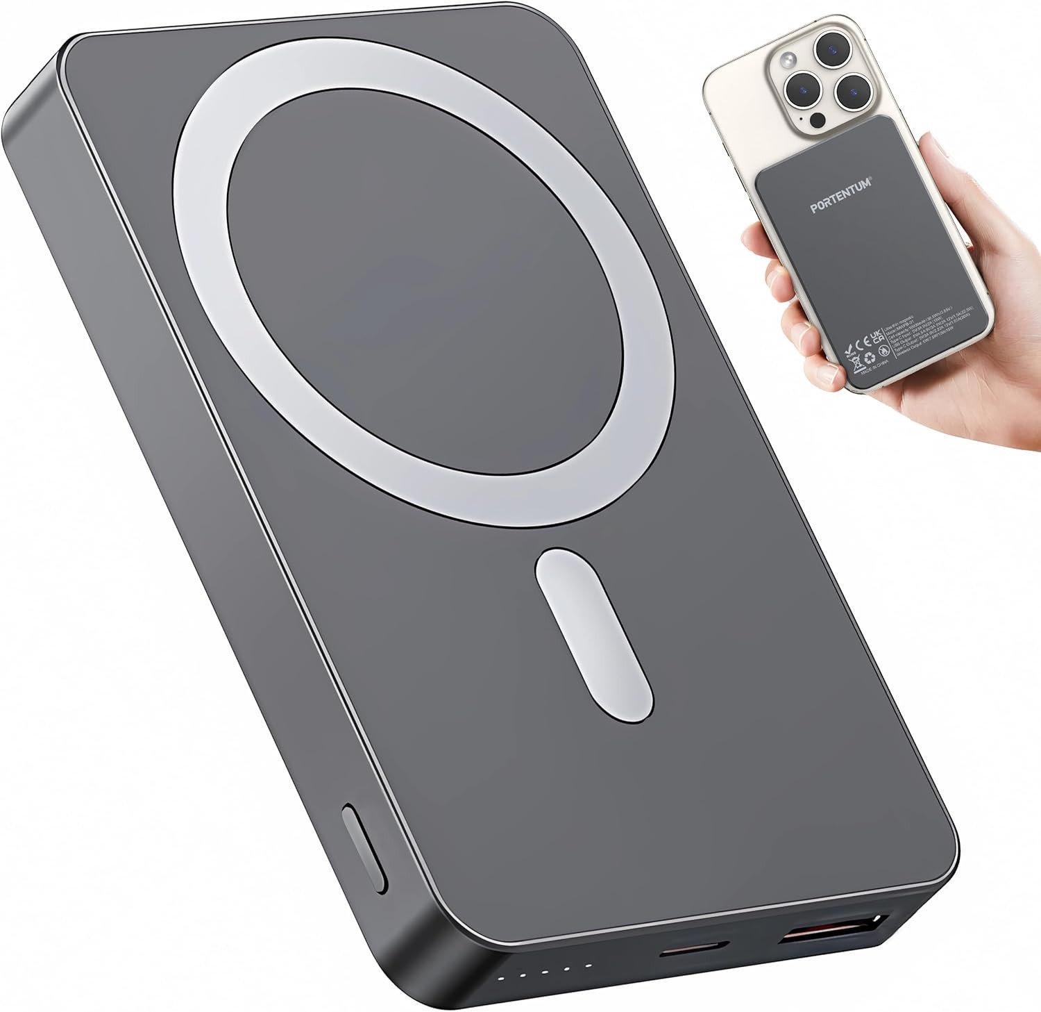 PORTENTUM MagSafe power bank fast charging 10000 mAh ultra-slim 14 mm – Portable charger magnetic 22.5 W PD & QC – Qi 15 W wireless – Battery pack USB-C + USB-A for iPhone Samsung Smartphones Tablets