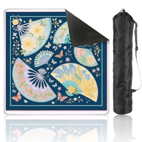 DERUINVAIO Mahjong Mat 80x80cm Japanese Fan Butterfly Pastel Colors Navy Blue Mah Jong Set Game Table Cloth Noise Reduction Non-Slip Portable Table Cover for Card Poker Board Tiles Games