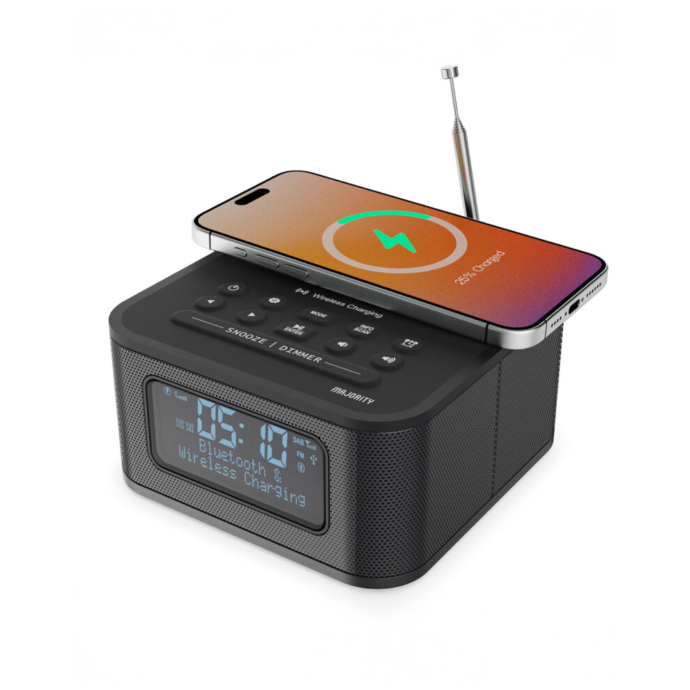 MAJORITY Knapton | Bedside Clock Radio with Bluetooth | 15W Wireless Charging & USB Charging Port | DAB+ and FM | Loud Dual Alarm, Sleep & Snooze Fun