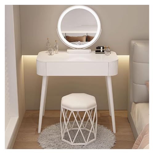 RoroCove Dressing Table,Vanity Desk, Makeup Vanity Desk Small with Lights White Drawers Make up Mirror Engineered Wood for Room(Round Stool,80x40x78cm)