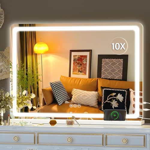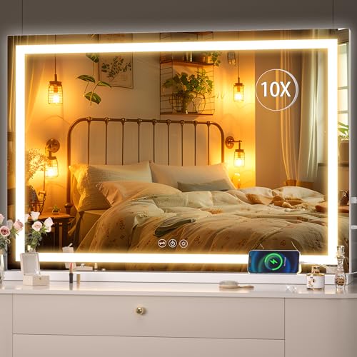 FUNTOUCH Large Lighted Vanity Makeup Mirror with light (X-Large Model)- 3 Color Lighting with 88 LED, 360° Rotation Touch Screen, 10X Magnification Portable Tabletop Cosmetic Make Up Mirrors