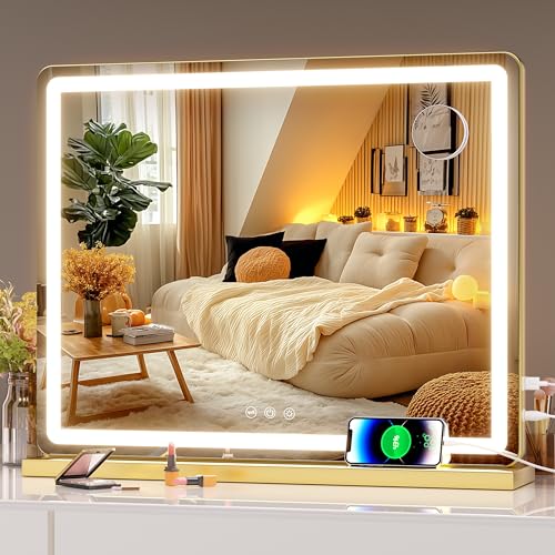 Hasipu Vanity Mirror with Lights, 58 x 48cm LED Makeup Mirror, Lighted Make up Mirrors with Dimmable 3 Modes, Touch Screen Control Vanity Mirrors Square Gold