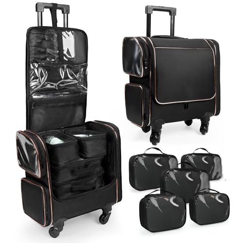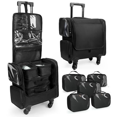 Rolling Makeup Train Case, Professional Makeup Organiser Case, Large Travel Cosmetic Organizer Make Up Storage Bag Trolley for Artist, Hairstylist, Vanity Beauty Box with 5 Toiletry Bags
