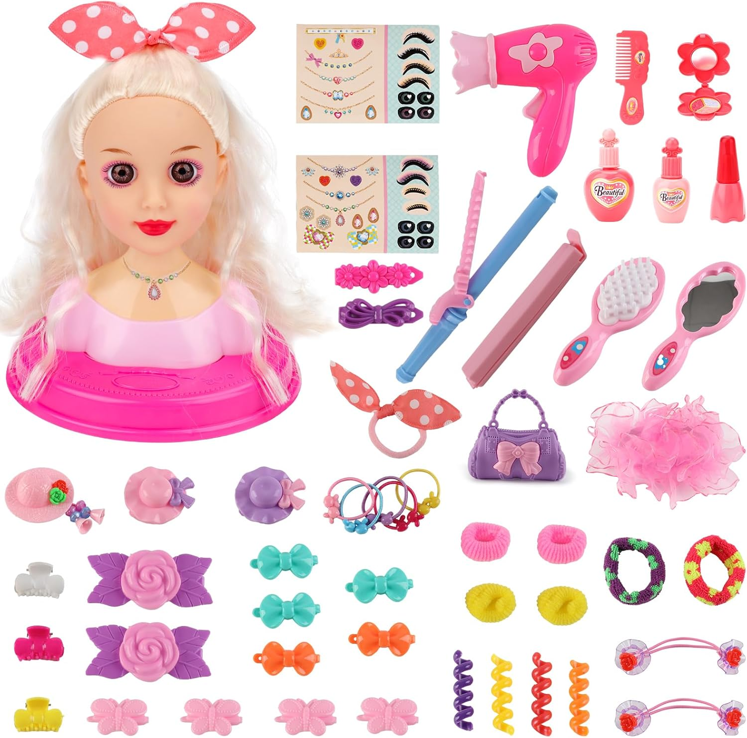 Kaoliscious Kids Hairdressing Makeup Styling Head Doll with Hairdryer and Hairpin, 33PCS Girl's Pretend Play Makeup Set, Hair Styling Head Doll 2025 Christmas and Birthday