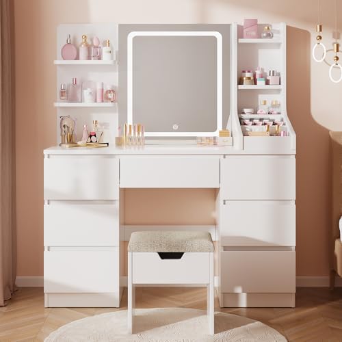 Airfish Dressing Table with Stool,Vanity Desk Set,3 Color Adjustable Brightness,Makeup Table with LED Mirror,Open Shelves and 7 Large Drawers for Modern Bedroom