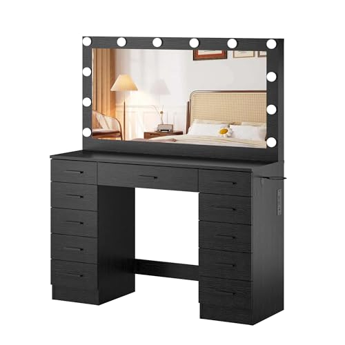 Panana Makeup Table Set with Large Mirror and Lights, Vanity Desk with 11 Drawers, Storage Cushioned Stool, Power Outlet, 3 Lighting Modes, Dressing Table for Bedroom Dressing Room (Black)