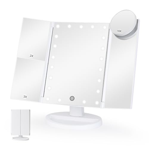 display4top Trifold Vanity Mirror with 21 LED Lights, 2X/3X/10X Magnification Table Mirror, Lighted Up Makeup Mirror with Adjustable Brightness Touch Control, Dual Power Supply, Gift for Women, White